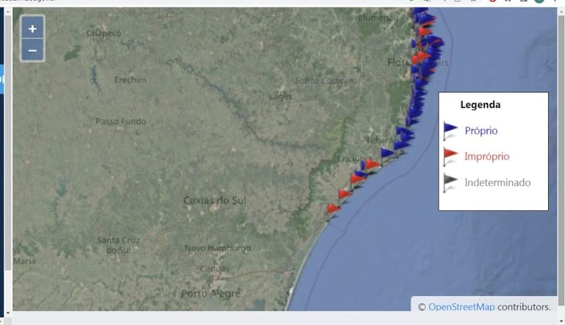 El Instituto de Medio Ambiente de Santa Catarina actualiza continuamente un mapa que indica las playas donde se detectaron banderas rojas, señalando que no son aptas para el baño.