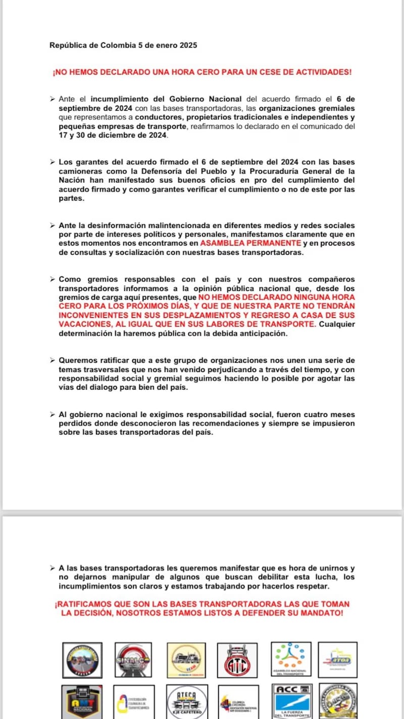 Por otra parte, también alertaron que en principio no afectará a los viajeros que regresan a sus hogares tras el Puente de Reyes. Sin embargo, la incertidumbre sigue presente, pues los transportadores no descartan que las tensiones aumenten si no hay respuestas del Gobierno.