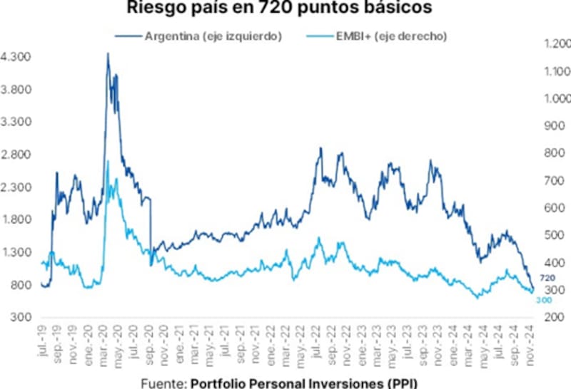 El valor actual del riesgo país es el nivel más bajo desde el 1 de marzo de 2019 (718 pbs). A su vez, se encuentra 892 puntos básicos por debajo de la mediana del Gobierno anterior.