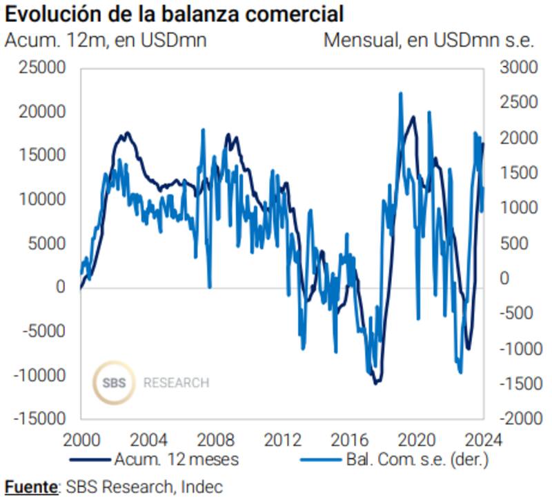 "El 2024 cerrará superavitario en la balanza comercial, aunque habrá que seguir muy de cerca la dinámica en la cuenta corriente para evaluar posibles presiones por el lado del sector externo. Este año, un TCR alto en los primeros meses del año tras la devaluación de diciembre impulsó exportaciones a la vez que, junto a la recesión, contuvo importaciones. Además, el superávit energético, y el ´dólar Blend´, también ayudaron", explicó.