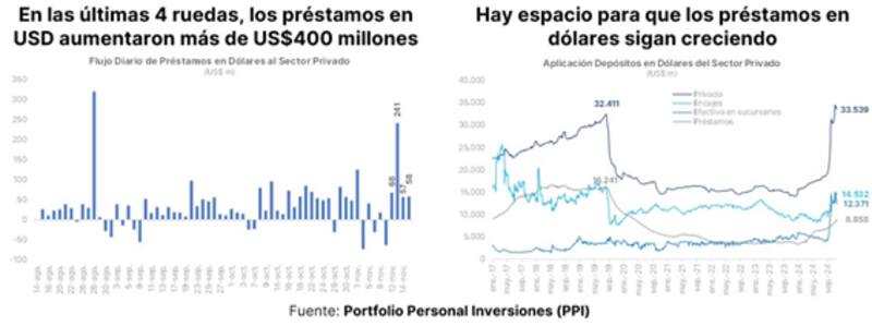 Además, detallaron que, entre el 12de noviembre y el 15 de noviembre, cuando el BCRA adquirió u$s 610 millones (casi la mitad de lo comprado en noviembre), los préstamos en dólares treparon u$s 424 millones, la mayor suba para cuatro días desde fines de diciembre 2001.