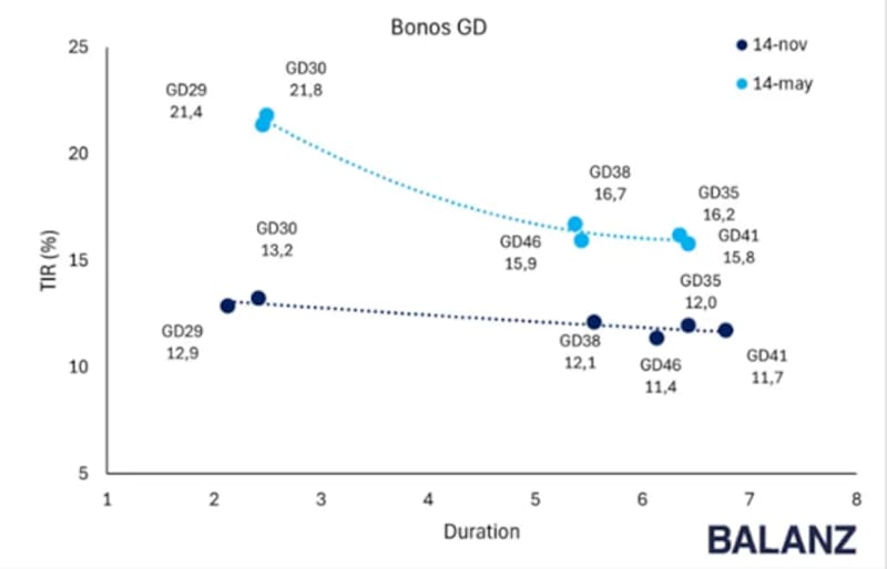 "En un escenario de seis meses en que la curva soberana logre normalizarse, alcanzando niveles de calificación crediticia CCC+ o B-, es decir, tasas entre 9% y 11%, consideramos que los GD35 y GD41 son los bonos con mayor potencial de alza. Sus bajas paridades y mayor duración modificada compensan el tramo corto de la curva", indicaron.