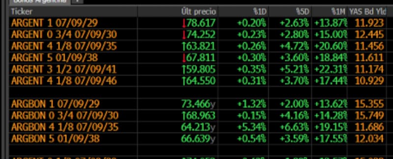 El Global 2029 y el Global 2030 suben 14% y 15% respectivamente. En el caso de los bonos a 2035 y 2038, las subas son de 20% y 19% respectivamente, mientras que los bonos más largos, a 2041 y 2046 operan con subas en el último mes de 22% y 17% respectivamente.