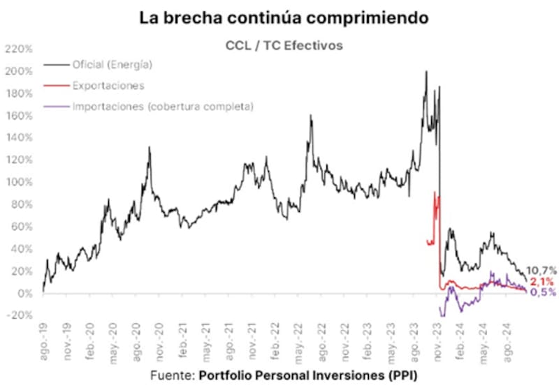 "Con la baja de ayer del CCL de 0,3%, la brecha cambiaria cerró en 10,7%, el menor nivel desde el septiembre de 2019 (9,7%). Una brecha tan baja sumado a un spread positivo entre la tasa en pesos y el crawl incentiva a los exportadores a adelantar liquidación y a los importadores a postergar pagos. Es decir, optan por hacer estrategias de carry trade, lo que da lugar a una mayor oferta privada en el mercado oficial que es captada en gran parte por el BCRA dada una demanda privada más contenida", explicaron desde PPI.