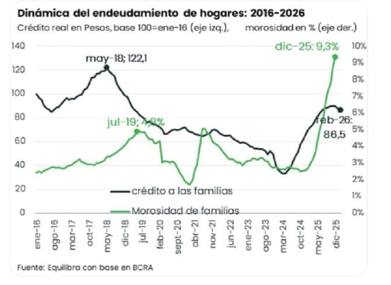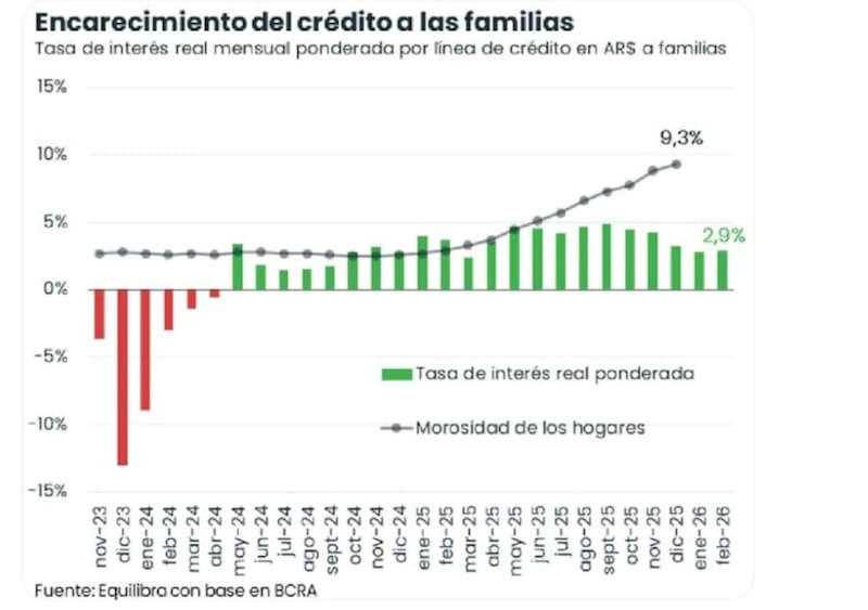 Informó que el crédito a las familias amortiguó el impacto de la fuerte caída de ingresos de 2024 sobre el consumo, al trepar 74% en términos reales. Pero advirtió que “en el segundo semestre 2025 se convirtió en un problema: la tasa de interés real mensual rondó 4% y la morosidad bancaria de hogares rozó 10%”.