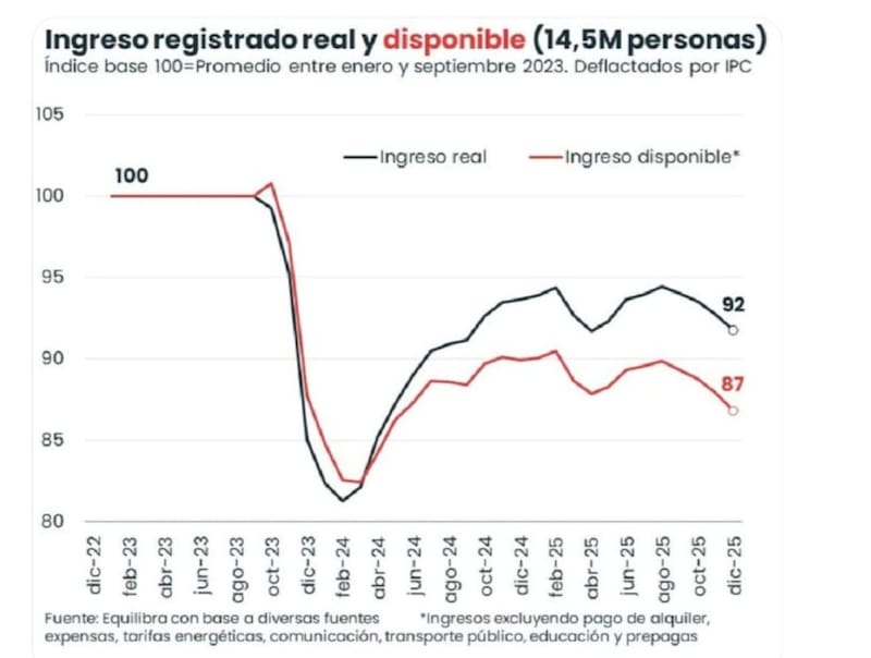 “La caída del poder adquisitivo del ingreso disponible es la q más preocupa. Al descontar gastos fijos -alquiler, expensas, tarifas, transporte, educación y prepagas- la merma en la gestión Milei alcanza 13%, 5.p.p. mayor a la contracción del ingreso real promedio formal (-8%)”, señaló en un hilo de la red social X el economista de Equlibra Lorenzo Sigaut Gravina.