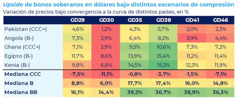 En cuanto a los bonos que ven con mayor valor, Yarde Buller prioriza el GD41 y GD35, con upside potencial de 16-18% si Argentina converge a la me-diana de los créditos "B" y 39% si converge a la mediana de los créditos "BB".