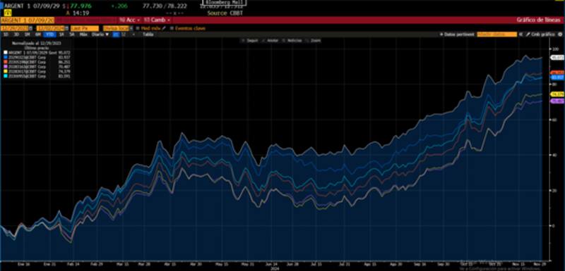 Las ganancias en los bonos en lo que va de 2024 son históricas. Los títulos muestran ganancias de entre 70% y 95%, lo cual hundió al riesgo país a mínimos.