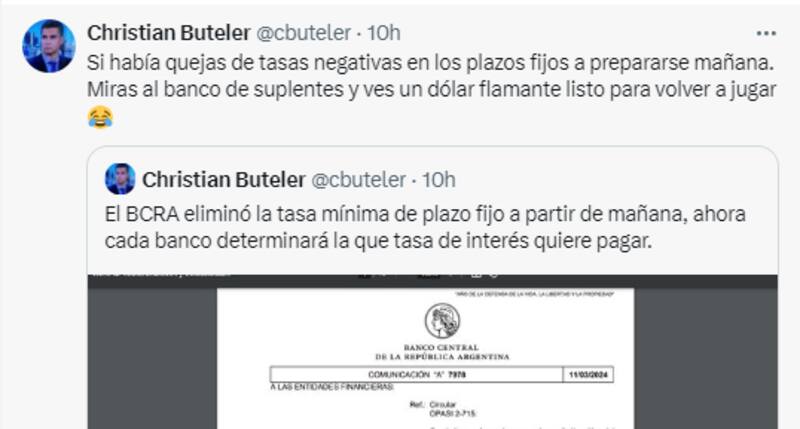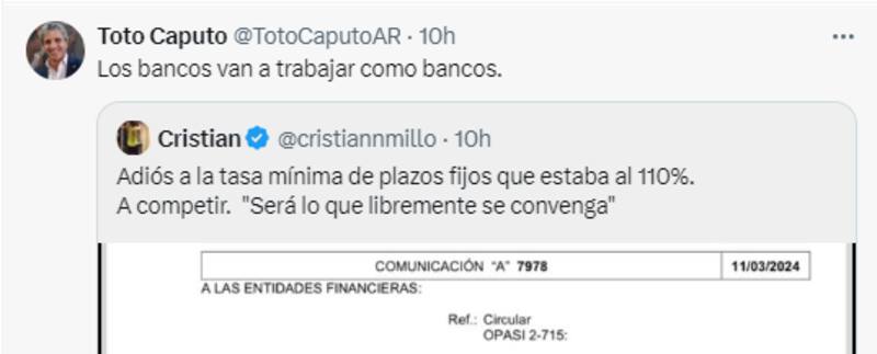 El ministro de Economía, Luis Caputo, destacó en las redes sociales la eliminación de la tasa mínima de plazo fijo, que se situaba en 110%, y que el Gobierno había decidido mantener cuando asumió Santiago Bausili en el Banco Central.