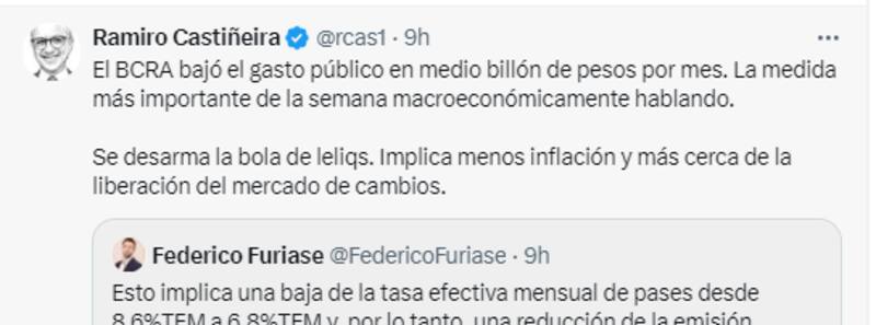 "El BCRA bajó el gasto público en medio billón de pesos por mes. La medida más importante de la semana macroeconómicamente hablando. Se desarma la bola de leliqs. Implica menos inflación y más cerca de la liberación del mercado de cambios", señaló el economista de Econométrica Ramiro Castiñeira.