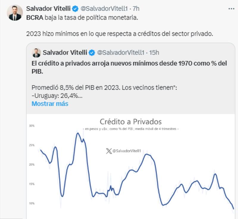 El head de research de Romano Group, Salvador Vitelli, destacó que con la reducción de tasas dejaría espacio para que los bancos agilicen el crédito. "BCRA baja la tasa de política monetaria. 2023 hizo mínimos en lo que respecta a créditos del sector privado", advirtió.