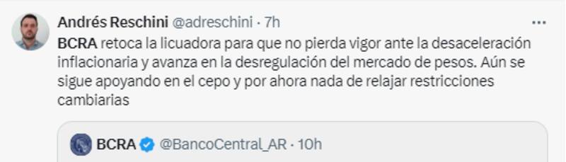 El economista de F2Finanzas Andrés Reschini destacó que el "BCRA retoca la licuadora para que no pierda vigor ante la desaceleración inflacionaria y avanza en la desregulación del mercado de pesos. Aún se sigue apoyando en el cepo y por ahora nada de relajar restricciones cambiarias", advirtió.