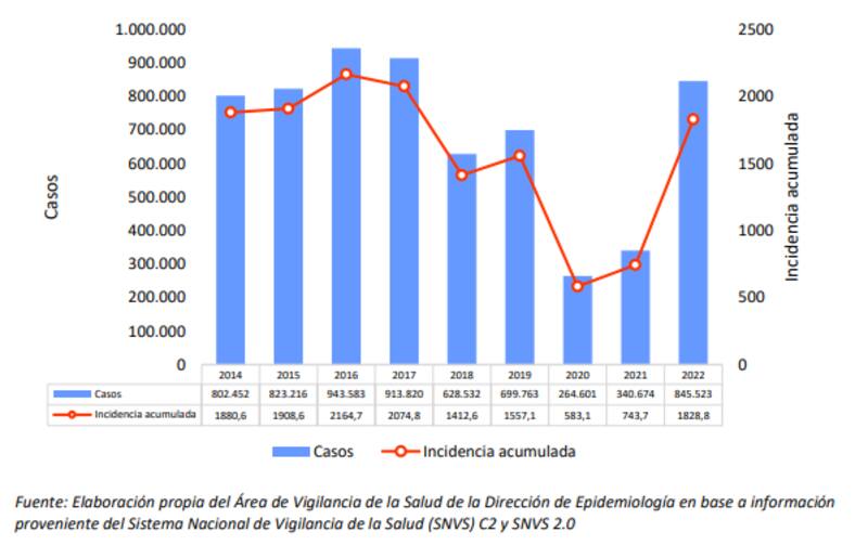 Y agregó: "Si bien los años 2020 y 2021 fueron afectados por la pandemia para la notificación agrupada numérica, se observa un aumento también respecto de los dos años previos (2018 y 2019) para el mismo período en el presente año".