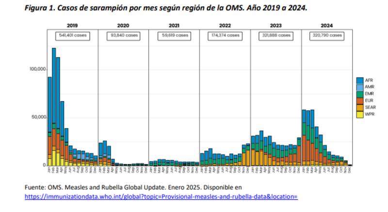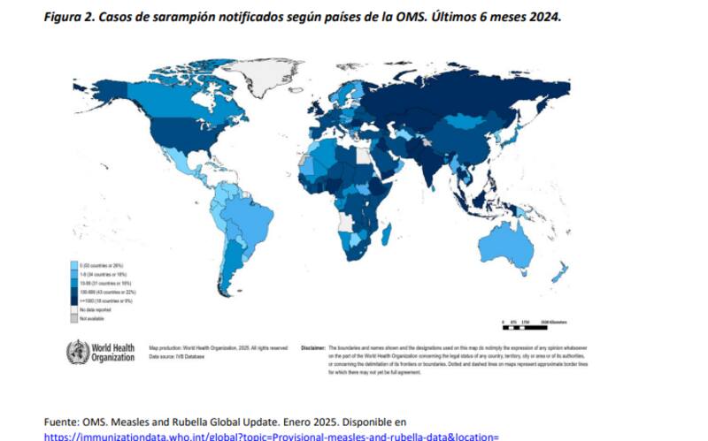 Aunque Argentina eliminó la circulación endémica del sarampión en el año 2000, los casos importados representan un riesgo significativo, especialmente en contextos de baja cobertura vacunal. Según la Organización Mundial de la Salud (OMS), en 2024 se notificaron más de 320.000 casos confirmados de sarampión en 184 países, lo que refleja un aumento global de la enfermedad.
