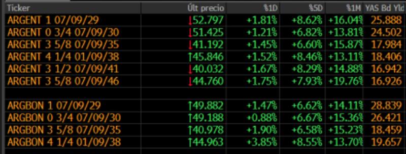 En el tramo medio, los bonos a 2035 y 2038 registran una ganancia de 1,4% y 1,5% respectivamente, mientras que en el extremo más largo, las subas son de 1,67% y 1,75% para los bonos a 2041 y 2046.