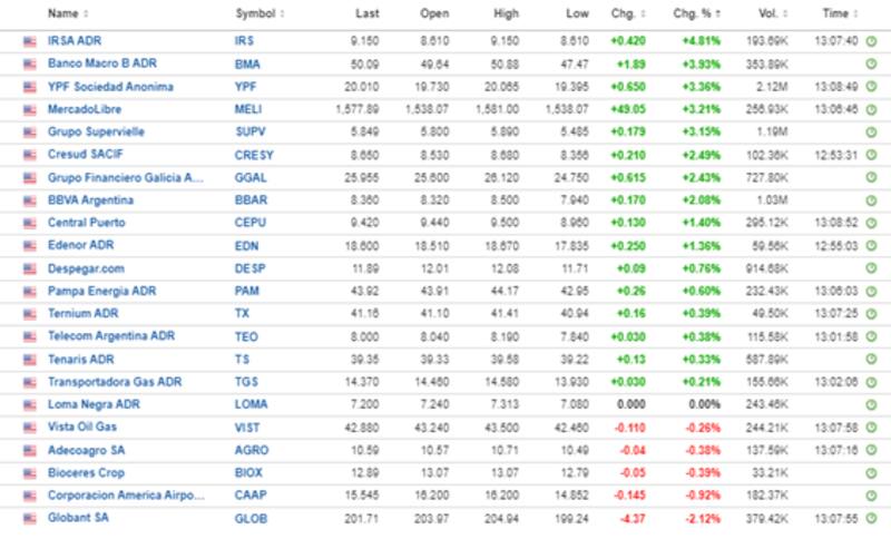 Otros papeles como YPF, MercadoLibre, Grupo Supervielle, Cresud, Grupo Financiero Galicia, BBVA, Central Puerto y Edenor también suben, con ganancias de 1,3% y hasta 3,3%.