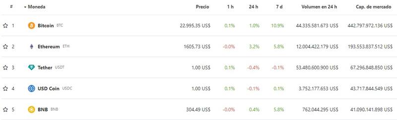 Bitcoin (BTC) conserva el primer puesto como la moneda más importante del mercado y abre la jornada con números en verde, a diferencia de ayer. Particularmente, su cotización su ubica en u$s 22.995,35, lo que se traduce en un aumento del 1,0%en 24 hs y 10,9% en los últimos 7 días.