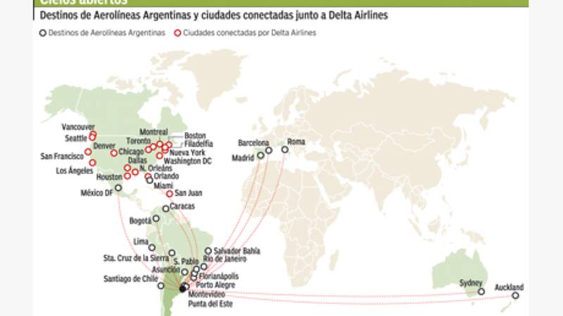 La alianza con Aerolíneas le permitirá a Delta sumar ocho destinos dentro de la Argentina y seis destinos en Sudamérica: Río de Janeiro y San Pablo (Brasil), Santa Cruz (Bolivia), Santiago de Chile, Asunción (Paraguay) y Montevideo (Uruguay).