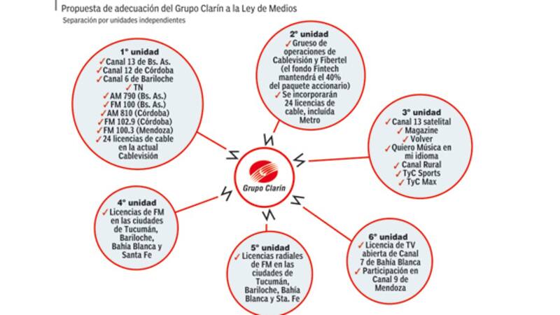 Luego de cuatro años de oposición y tras no haber logrado que la Corte Suprema de la Nación declarara inconstitucionales varios artículos de la ley, Clarín debió estructurar una propuesta para dividirse en seis unidades diferentes e independientes entre sí. Ahora, analiza una serie de propuestas que recibió para desprenderse de varias empresas. En especial, las agrupadas en las unidades tres, cuatro, cinco y seis.