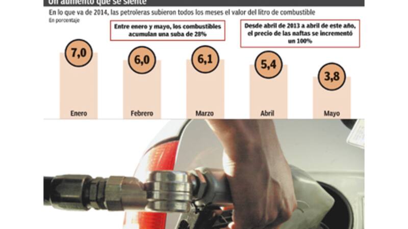 Pero anteriormente a esa discusión, en los dos primeros meses del año, ya se habían aplicado otros incrementos. Es decir que en lo que va de 2014, las petroleras subieron todos los meses el valor del litro de combustible: 7% en enero; 6% en febrero; 6,1% en marzo; 5,4% en abril, y desde el jueves próximo le sumarán otro 3,8%. con lo que el aumento acumulado durante lo que va del año será de 28%.