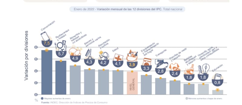 La suba mensual de enero fue impulsada por rubros como comunicación, restaurantes y hoteles y alimentos y bebidas no alcohólicas. Mientras que el IPC Núcleo registró un alza de 3,3%, con un acumulado de 54%.