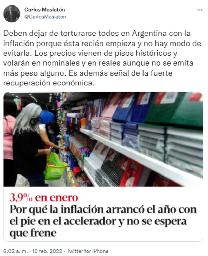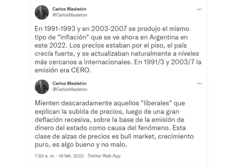 El abogado, experto en bitcoin y aliado político del diputado Javier Milei, Carlos Maslatón, aseguró este miércoles que la inflación que se registró en enero 2022, "es una señal de la fuerte recuperación económica" y cruzó a "aquellos liberales" que "mienten" al intentar explicarla "sobre la base de la emisión".