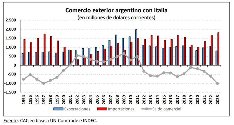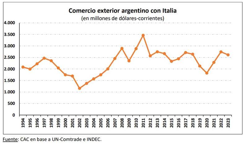 Un análisis de la Cámara Argentina de Comercio y Servicios (CAC) muestra que, en 2023, el intercambio comercial entre Argentina e Italia fue de 2614 millones de dólares, 4,7%menor a 2022.
