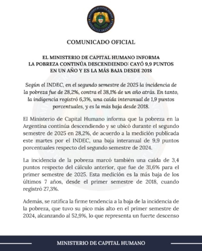 “Gracias a la implementación de políticas económicas que han contribuido a reducir la inflación y estabilizar la economía, sumado a las acciones encaradas desde el Ministerio de Capital Humano, focalizadas hacia los sectores más vulnerables, de manera directa, transparente y sin intermediarios, la pobreza continúa descendiendo en la Argentina”, concluyó el escrito.