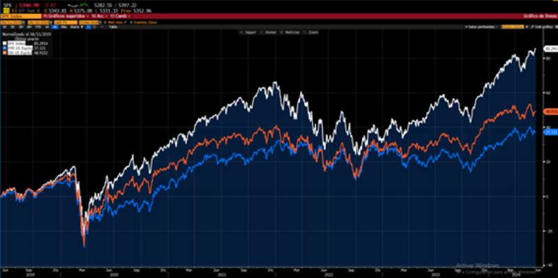 A nivel sectorial, estos también muestran grandes subas en el año. El sector de servicios gana 10% en el 2024, al igual que el financiero. Otros como el de mineras, consumo básico, salud, energía e industrial avanzan 7% en 2024.