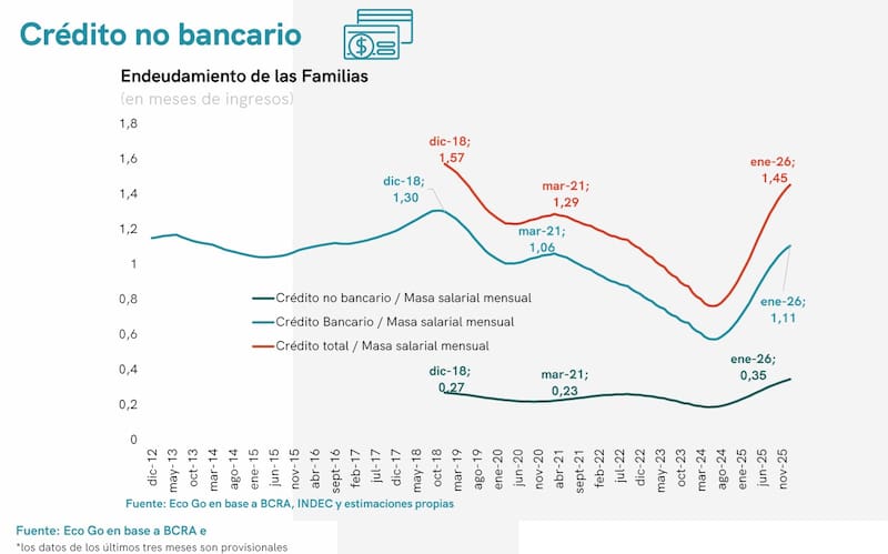 Asimismo, el 91% del crédito no bancario va destinado a familias, si bien el endeudamiento de los hogares con entidades no bancarias disminuyó respecto de diciembre del 38,7% de la masa salarial al 37% en enero. Al incorporar también el crédito bancario, el peso del crédito en los sueldos desciende de 158,4% en diciembre a 147,6% en enero.