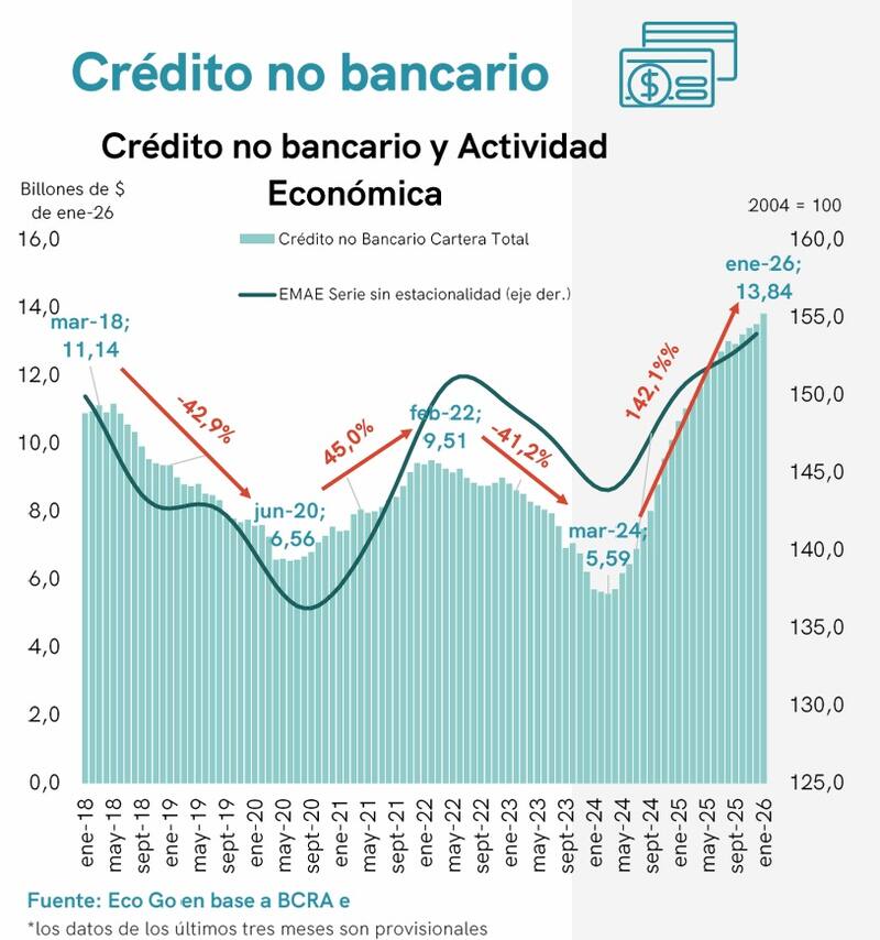 En el primer mes del año, el crédito aumentó 2,3% mensual en términos reales y acumuló un stock de $ 13,84 billones y nuevamente, como viene sucediendo hace un cuatrimestre, lo hizo a un ritmo mayor que el bancario.