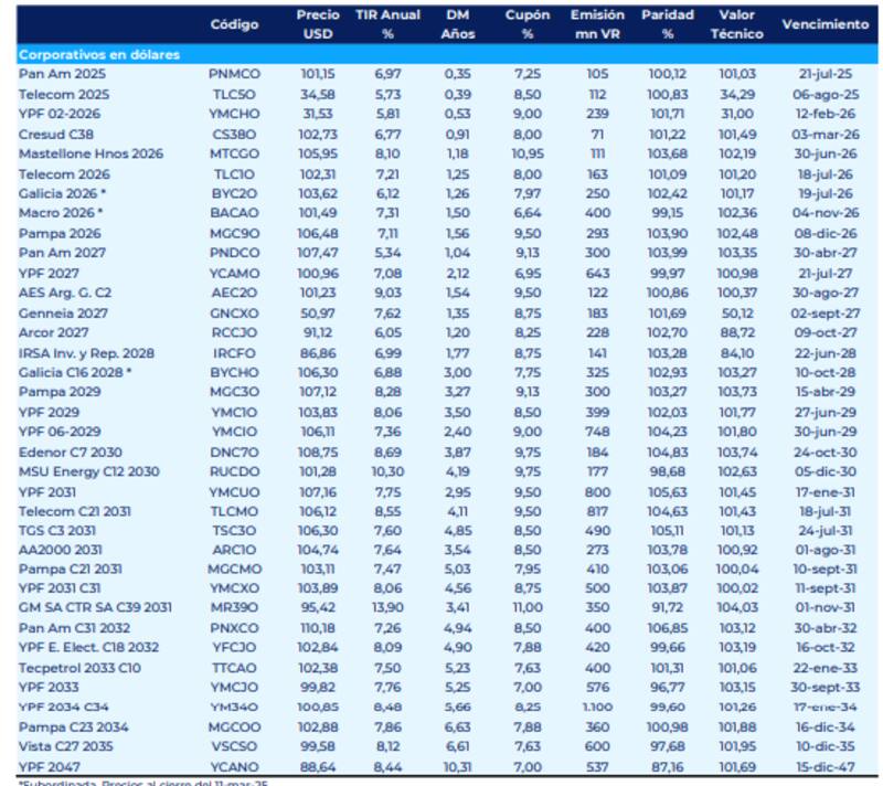 Dentro de Ley Argentina, sugiere Loma Negra 2025 (TIR 6,9%), Central Puerto 2026 (TIR 7,2%) y Minera Exar 2027 (TIR 8,9%).
