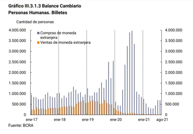 Allí pudo verse que en el octavo mes del año las compras de dólar ahorro fueron efectuadas por un total de 697.000 personas, 6000 más que en julio y 254.000 más que en junio.