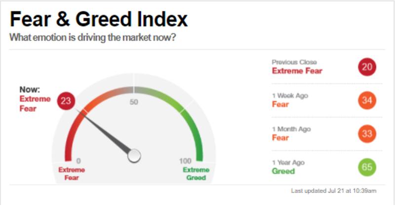 En cambio, para saber cuando están todos temerosos, al acceder al indicador de CNN, si la aguja se encuentra en niveles de "Extreme Fear", estará indicando que el pesimismo abunda en Wall Street y podría ser un buen momento para comprar acciones.