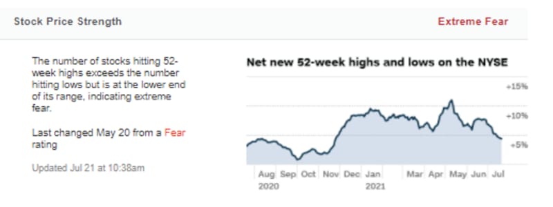 Si abundan la cantidad de acciones que están haciendo nuevos mínimos, el indicador se satura hacia "Extreme Fear" y si la mayoría de las acciones alcanzan nuevos máximos, el mismo se tornará "Extreme Greed", reflejando que hay cada vez mas inversores dispuestos a pagar precios cada vez mas altos, dando a entender que el sentimiento de mercado es positivo.
