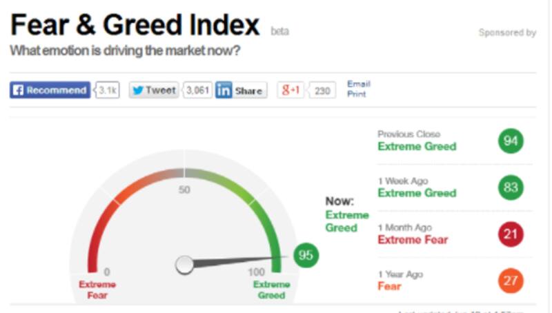 Para saber cuando están "todos codiciosos", se puede acceder al Fear and Greed Index y si la aguja se ubica en niveles de "Extreme Greed" estará indicando que el humor que esta siendo liderado en el mercado actualmente es mayormente positivo. Por ello, podría ser un riesgo comprar acciones dada las chances de una cercanía de una caída debido a que es esperable que el mercado vuelva a castigar consensos, como suele hacer de forma permanente.