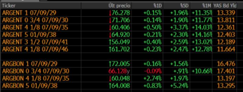 Los bonos vienen de fuertes subas en las últimas jornadas, con un rally de entre 2% y 3% en la última semana, y acumulando ganancias de entre 12% a 14% en el último mes.