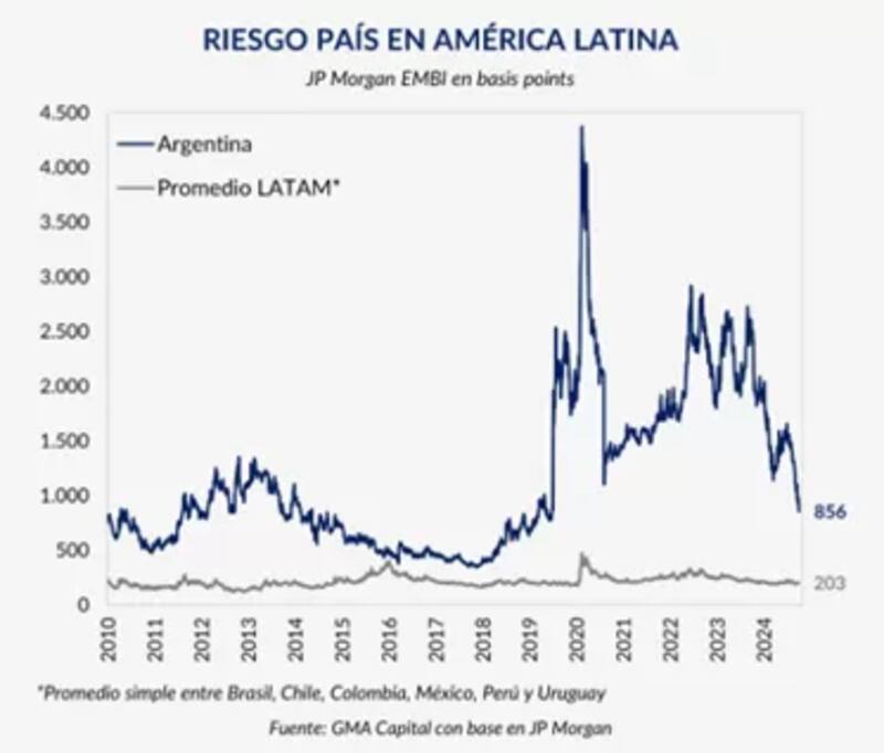 Con este avance, el riesgo país cae a los 818 puntos, el nivel más bajo en la era Milei.