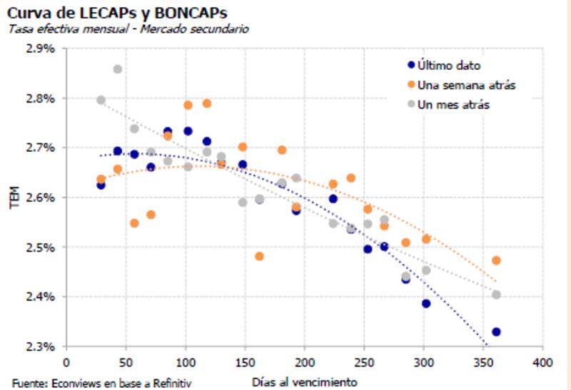 La tasa de interés de la política monetaria se ubica en 2,7% mensual, mientras que las tasas de las Lecap operan en niveles de entre 2,7% en el tramo corto y 2,4% mensual en el tramo largo.