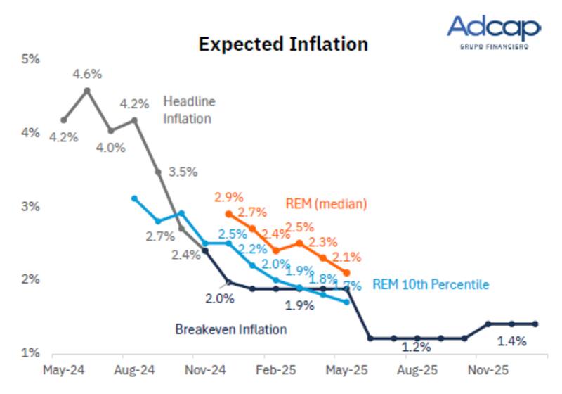 Según cálculos de Adcap Grupo Financiero, el mercado espera un 1,9% de inflación promedio entre diciembre y mayo, para luego ver una reducción al 1,2% mensual en promedio hasta octubre del año entrante.