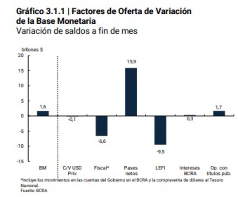 "Esta expansión fue abastecida por el desarme de la posición de pases pasivos por parte de las entidades financieras, parcialmente compensado por el efecto contractivo de las operaciones de mercado abierto a través de LeFi", asegura la autoridad monetaria.