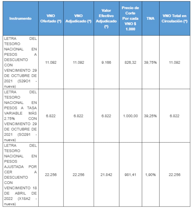 Yendo a la licitación, se emitieron dos nuevas letras (LEDE y LEPASE) con vencimiento el 29 de octubre. A su vez, se licitó una nueva letra a descuento ajustable por CER con vencimiento en abril del 2022. Se recibieron 505 ofertas, adjudicándose un total de VNO$ 40.170 millones, lo que representa un valor efectivo de $ 37.830 millones.