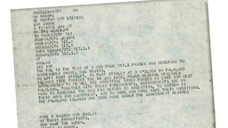El télex fue enviado el 14 de junio por el general Moore, comandante de las tropas terrestres británicas en Malvinas, a la sede central de Comunicaciones del gobierno británico, GCHQ por sus siglas en inglés.