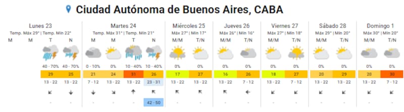 - Lunes 23: mínima de 22°C y máxima de 29°C, con tormentas fuertes por la tarde y tormentas aisladas por la noche.