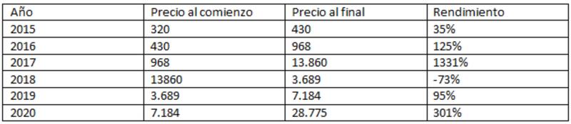 - El promedio de rendimientos de los 6 años estudiados es de 302%, lo cuál quiere decir dos cosas: que el año pasado tuvo un rendimiento anual que es casi exacto el promedio de los anteriores 5, y que este año si cumple con su promedio histórico podría cerrar en 86.325 dólares. Pero si este escenario se da, entonces se cortaría el patrón de aceleramiento en los rendimientos mencionado anteriormente, porque el rendimiento del 2021 sería igual al del 2020.