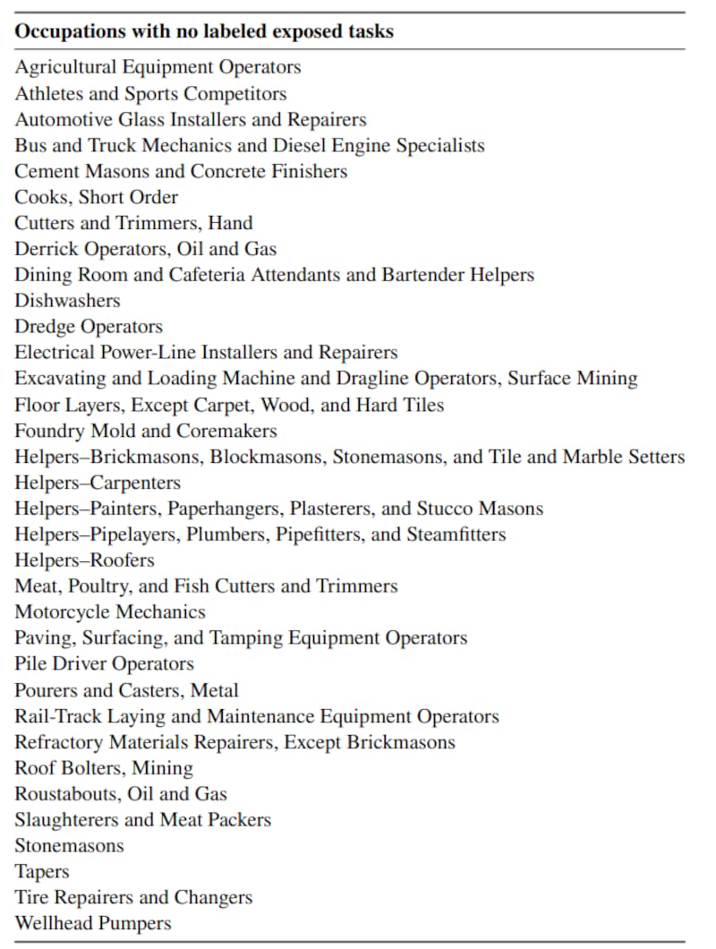En contraparte,los empleos que no se verán afectados por ahora son los operadorees de maquinaría agrícola, los atletas, los cocineros, los albañiles, los mecánicos o los instaladores de líneas eléctricas, entre muchos otros.
