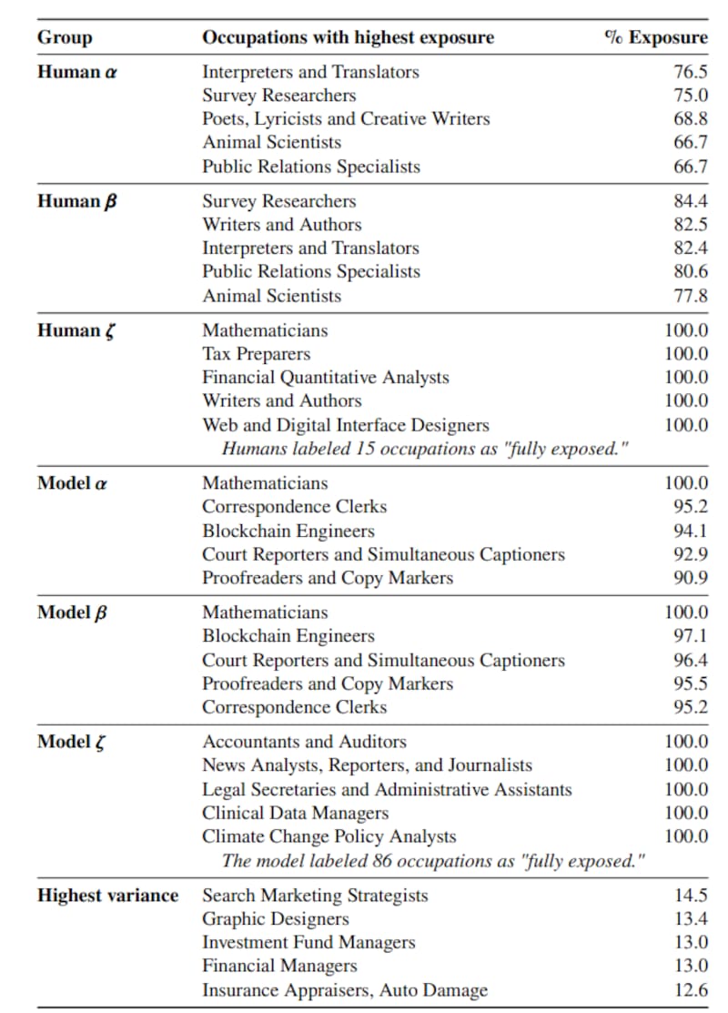 "Las ocupaciones enumeradas en esta tabla son aquellas en las que estimamos que las GPT y el software impulsado por GPT pueden ahorrar a los trabajadores una cantidad significativa de tiempo en la realización de una gran parte de sus tareas, pero esto no sugiere necesariamente que sus tareas puedan automatizarse completamente mediante estas tecnologías", explicó OpenAI.