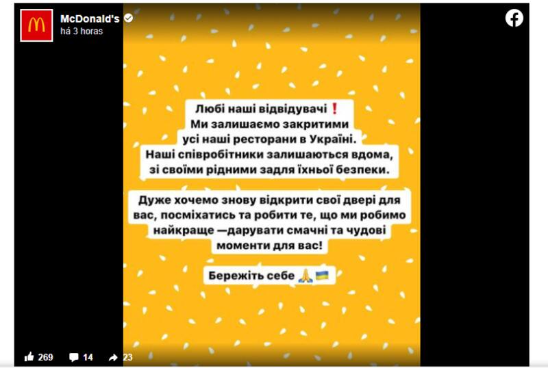 "Los restaurantes han cerrado hasta que la situación se estabilice, el equipo continúa trabajando en Ucrania en el contexto de crisis y nos encontramos resolviendo el problema del pago urgente de salarios a los empleados", indicó.