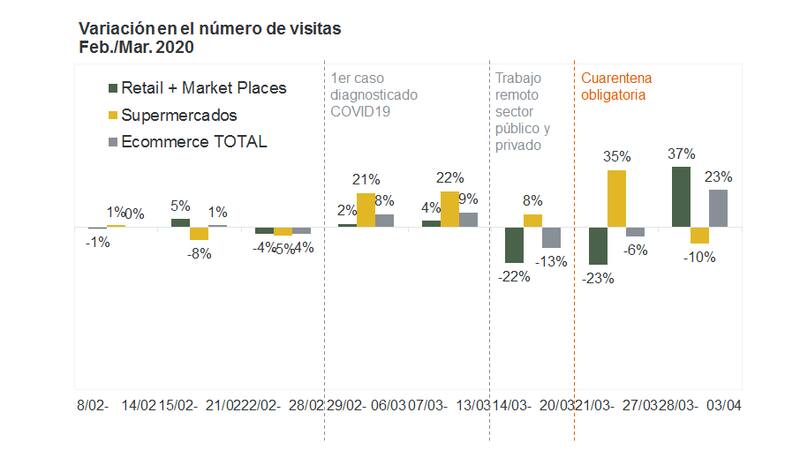 GFK mide también las visitas que se producen, tanto presenciales como en Internet en los e-commerce de las cadenas. Previo a que se detectara el primer caso, las visitas daban un guarismo negativo. A partir que se detectó el primer caso, pasaron a 21% y 22% en supermercado, y 2% y 4% en retails y sus e-commerce.