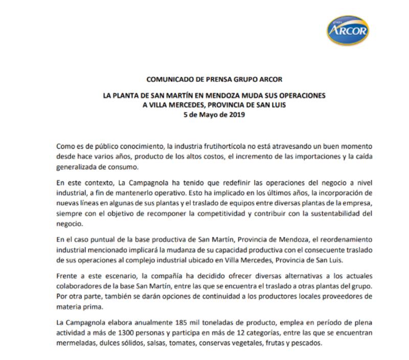 “En el caso puntual de la base productiva de San Martín, provincia de Mendoza, el reordenamiento industrial implicará la mudanza de su capacidad productiva con el consecuente traslado de sus operaciones al complejo industrial ubicado en Villa Mercedes, San Luis , añadió. “Frente a este esquema, la compañía ha decidido ofrecer diversas alternativas a los actuales colaboradores de la base San Martín, entre las que se encuentra el traslado a otras plantas del grupo. Por otra parte, también se darán opciones de continuidad a los productores locales proveedores de materia prima , amplió.